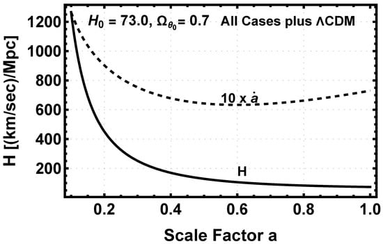 The dark energy only Hubble parameter is used in Equation (13) to be consistent with the dark energy only derivation of the scalar; however, when the matter density is introduced in Section 11, the Hubble parameter for both dark energy and matter should be used since it sets the time evolution of the scale factor . Equations (7) and (13) provide the useful relation