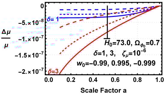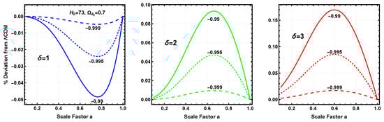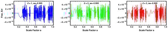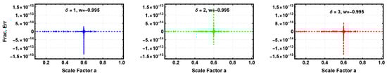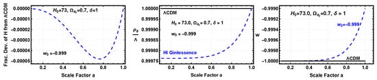 Due to the many successes of the CDM cosmology in matching the observational data, the dark energy EoS values were purposely set close to but not equal to −1. The and case is the closest one to CDM. All of the cases are thawing, which means that the maximum value of w is , and the early time values of w are very close to −1. It is this dynamical case, of all studied in this work, that has the best chance of having a likelihood close to that of CDM. In earlier plots that show evolutions for all cases, the evolution of this case is often hard to discern, since it is much smaller than the maximum evolution case in the plots. To better illustrate the , evolutions, Figure 15 plots the fractional deviations from CDM of this case only for the Hubble parameter, the dark energy density, and the dark energy EoS.