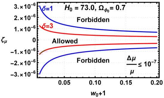 The positive and negative tracks for each case are due to the positive and negative values for in Equation (49). The more restricted allowed area is due to the greater evolution of as shown in Figure 16, which requires a smaller to meet the constraint than the case. The CDM point in the figure is the 0, 0, origin where and . A confirmed observation of with no detected variance of would place a hard limit on the particle physics parameter but would also require new physics to account for the deviation of w from −1.
