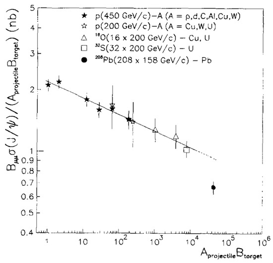 CERN was already running ion beams O and S with the NA38 experiment at the Super Proton Synchrotron (SPS) in 1989. A few years later, the NA50 experiment started collecting PbPb interaction data. Designed to measure muons from vector meson decays, NA50 released the cross section measurements (Scaled by the factor , the product of the projectile A and target B mass numbers) from NA38 p+A collisions and NA51 AB collisions to compare with the new cross section measurements (Scaled by the factor , the product of the projectile A and target B mass numbers) from Pb+Pb collisions [6]. In Figure 2, the measurements taken in p+A collisions fall along a similar trendline. But the suppression observed in Pb+Pb collisions was ∼5 standard deviations below the trend seen in p+A collisions, with the behavior described as anomalous suppression.