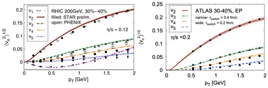 RHIC at BNL completed construction in the late 1990s and started recording its first data in 2000, where the “main goal of the RHIC heavy ion program is the discovery of the novel ultra–hot, high–density state of matter predicted by the fundamental theory of strong interactions and created in collisions of heavy nuclei, the Quark–Gluon Plasma (QGP) [7]”. In 2005, all four experimental programs at RHIC at the time—PHENIX, STAR, BRAHMS, and PHOBOS—announced the formation of dense partonic matter in Au+Au collisions consistent with quark-gluon plasma [8,9,10,11]. Results from Pb+Pb data were available from the LHC as soon as 2011 [12,13], and the collective behavior of the highly dense system was modeled using viscous fluid dynamics in a 2012 paper by theorists Charles Gale, Sangyong Jeon, Björn Schenke, Prithwish Tribedy, and Raju Venugopalan [14]. They showed that hydrodynamics successfully describes the anisotropic flow coefficients measured by ATLAS and PHENIX (see Figure 3), as well as for ALICE and STAR.