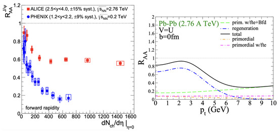 The nuclear modification of in Au+Au collisions was an early measurement published by the PHENIX Collaboration [28], which started recording data in the year 2000. As the years progressed, upgrades were installed, and the recorded luminosity increased. Shown on the left of Figure 4 [29] is the PHENIX nuclear modification from Run 4 (blue data points) [30] as a function of multiplicity density compared with the same measurement made with the ALICE detector (red data points) [31]. Consistent with the predictions by Matsui and Satz and similar to the NA50 Collaboration findings, the suppression observed in Au+Au collisions by PHENIX is extremely strong. The results at the lower RHIC energies of 200 GeV per nucleon-nucleon collision are consistent with the final state effect of quark–gluon plasma formation. However, we see distinctly different behavior at the LHC, where the nuclear modification does not reach the level of suppression seen at the RHIC. This striking difference can be explained by regeneration, which can modify yields at the higher LHC energies.