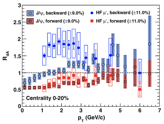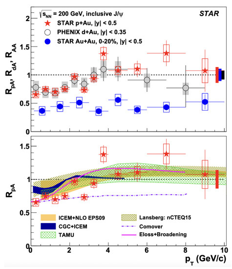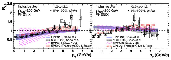- Adare, A. et al. [PHENIX Collaboration] Transverse-Momentum Dependence of the J/ψ Nuclear Modification in d+Au Collisions at . Phys. Rev. C 2013, 87, 034904. [Google Scholar] [CrossRef]