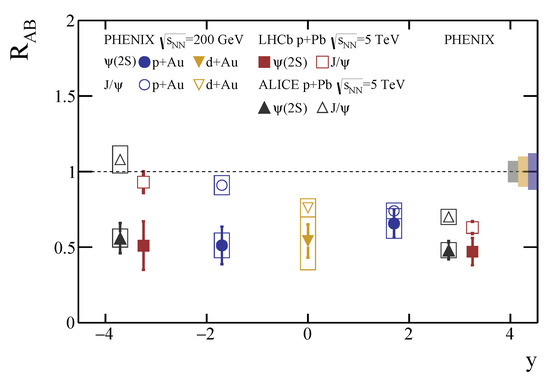 - Adare, A. et al. [PHENIX Collaboration] Cold Nuclear Matter Effects on J/ψ Yields as a Function of Rapidity and Nuclear Geometry in Deuteron-Gold Collisions at . Phys. Rev. Lett. 2011, 107, 142301. [Google Scholar] [CrossRef]