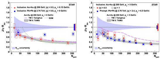 The data are compared with three different theoretical models (see [52] for model descriptions). In both the left and right plots, the magenta dashed line and the gray lattice curve represent transport model (TM) predictions from Tsinghua University [53] and Texas A&M University [46], respectively. In the left-hand plot only, there is an additional comparison to the statistical hadronization model (SHM). Both transport model predictions describe the data well at low in the left-hand figure. In contrast, the statistical hadronization model describes the data well up until the peripheral events (∼). At higher in the right-hand figure, the transport model predictions appear to either over-predict or under-predict the STAR suppression.