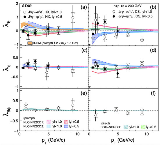- Adam, J. et al. [STAR Collaboration] Measurement of inclusive J/ψ polarization in p+p collisions at s =200 GeV by the STAR experiment. Phys. Rev. D 2020, 102, 092009. [Google Scholar] [CrossRef]