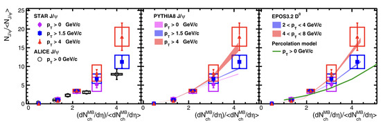 The data are compared with Monte Carlo generator calculations (see [54] for more details and MC references). The middle panel of Figure 10 shows three curves generated by PYTHIA8 [60] that correspond to each range of the data. Multi-partonic interactions, where more than one interaction per p+p collision occurs, were included in the PYTHIA calculation and can describe the increasing trend seen in the data as a function of charged particle multiplicity. In the far right panel, the data are compared with EPOS3 [61] calculations at higher and the percolation model [62] for GeV/c. Note that the EPOS3 curves correspond to open charm production and slightly different ranges than the data. The EPOS3 calculations also include multi-partonic interactions and agree well with the data. The percolation model, although developed for high-density p+p collisions at LHC energies, describes the STAR data well at GeV/c.