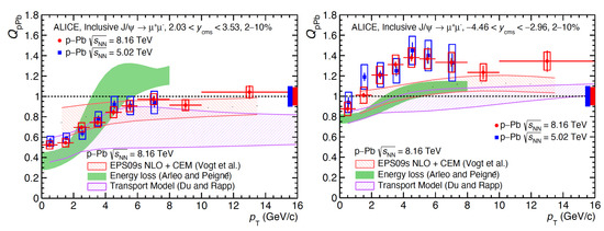 The nuclear modification in p+Pb collisions as a function of for the 2–10% centrality class at forward (left) and backward (right) rapidity [68]. The red (blue) data points correspond to (5.02) TeV collision energy. The data are compared with different theoretical models described in the text. Reprinted with permission from Springer Nature.