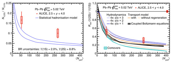 The (2S) to (1S) ratio of yields (left) and (right) as a function of at forward rapidity in Pb+Pb collisions [70]. The data are compared with different theoretical models described in the text. Reprinted with permission from Elsevier.