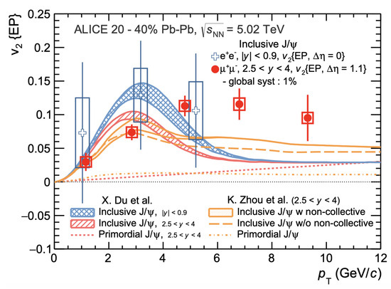- Acharya, S. et al. [ALICE Collaboration] J/ψ elliptic flow in Pb-Pb collisions at . Phys. Rev. Lett. 2017, 119, 242301. [Google Scholar] [CrossRef]