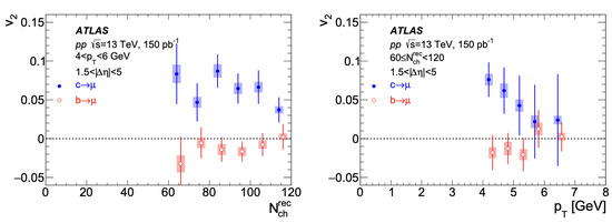 - Aad, G. et al. [ATLAS Collaboration] Measurement of azimuthal anisotropy of muons from charm and bottom hadrons in pp collisions at with the ATLAS detector. Phys. Rev. Lett. 2020, 124, 082301. [Google Scholar] [CrossRef]