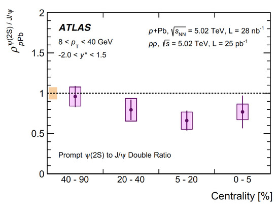 The (2S) to ratio in p+Pb collisions is shown in Figure 16 in the mid-rapidity region as a function of centrality [81]. The measurements were taken over the transverse momentum range GeV/c. It is expected that nuclear effects related to the initial state will cancel by taking the ratio between two charmonium states. These effects could include initial state energy loss or gluon shadowing, which depend on the target nucleus, collision energy, and rapidity and, therefore, would be the same for both states. The ratio’s final state effects remain, including the comover interaction, quark-gluon plasma formation, or potentially nuclear absorption effects (although nuclear absorption is not believed to make an impact at LHC energies due to the large Lorentz factor). The ratio of (2S) to is right around unity for peripheral collisions, and no clear difference in modification between the two states is observed. However, the (2S) is suppressed with respect to the for the more central 0–5%, 5–20%, and 20–40% centrality classes. Although coalescence is not expected to significantly contribute to charmonium production in p+Pb collisions, the range of the measurements at GeV/c likely falls beyond the region where coalescence effects are believed to occur. The uncertainties prevent any firm conclusions, but the data suggest the (2S) is more suppressed than the in central p+Pb collisions due to final state effects. These ATLAS results are consistent with the PHENIX and LHC data shown in Figure 7, where stronger suppression is observed at backward rapidity for (2S) with respect to due to final state effects in p+A collisions.