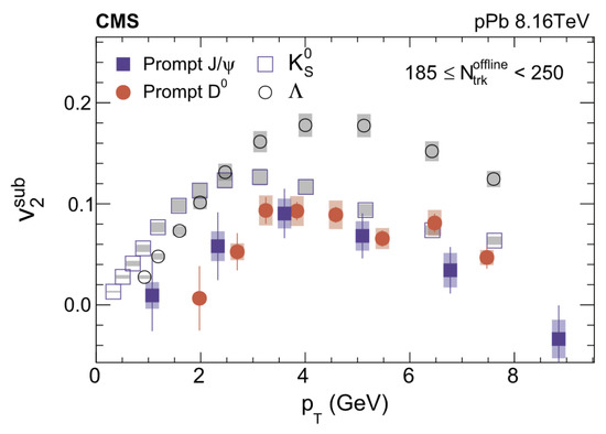 - Adam, W. et al. [CMS Collaboration] Observation of prompt J/ψ meson elliptic flow in high-multiplicity pPb collisions at . Phys. Lett. B 2019, 791, 172–194. [Google Scholar] [CrossRef]
