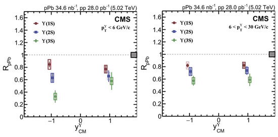 - Adam, W. et al. [CMS Collaboration] Nuclear modification of Υ states in pPb collisions at . Phys. Lett. B 2022, 835, 137397. [Google Scholar] [CrossRef]
