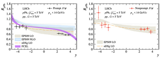 The data are compared with charmonium modification models, including gluon shadowing and energy loss (see [85] for model descriptions). The beige (blue) curve represents the EPS09 LO [86] (EPS09 NLO [87]) nuclear parton distribution functions, while the dashed orange (solid violet) curve represents the nDSg LO parameterization [86] (fully coherent energy loss FCEL model [88,89]). At forward rapidity, suppression of the nuclear modification factor is observed, consistent with RHIC and LHC data shown in Figure 7. The prompt contribution shows more substantial suppression than the nonprompt contribution. In both cases, the suppression is well described by the EPS09 LO gluon shadowing predictions. The nDSg LO model does not predict strong enough suppression for the prompt contribution; however, it describes the nonprompt measurements well. At backward rapidity, the EPS09 models predict stronger anti-shadowing effects than what is seen in the data. The nDSg LO and FCEL models best describe the hint of suppression at backward rapidity, suggesting the possibility of a nuclear effect beyond gluon anti-shadowing. The uncertainties are more considerable in the backward rapidity measurements for the nonprompt contribution, and both nDSg LO and EPS09 LO describe the data reasonably well.