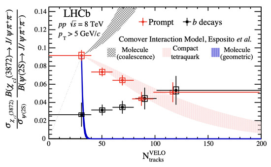 - Esposito, A.; Ferreiro, E.G.; Pilloni, A.; Polosa, A.D.; Salgado, C.A. The nature of X(3872) from high-multiplicity pp collisions. Eur. Phys. J. C 2021, 81, 669. [Google Scholar] [CrossRef]
