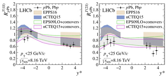 - Aaij, R. et al. [LHCb Collaboration] Study of Υ production in pPb collisions at . arXiv 2018, arXiv:1810.07655. [Google Scholar]