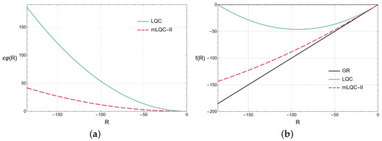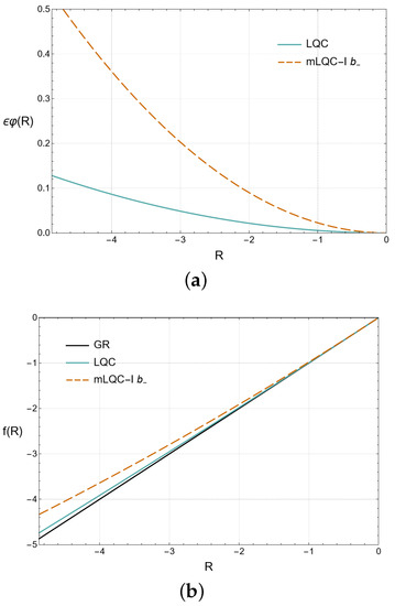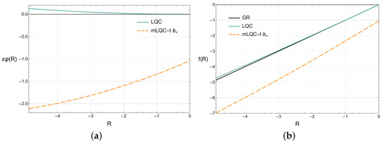 In order to better convey the magnitude of the deviation from GR in this case, we provide two different plots in Figure 1. In Figure 1a, we present the deviation of the effective Lagrangian density from the one we find in GR, as a function of R. In this plot, we are able to compare the deviation in the case of LQC, given by Equation (35), with that of mLQC-I, in the case of branch. Notice that we are plotting Equation (41), with , not the corresponding series expansion. In Figure 1b, we compare the effective functions of LQC and the branch of mLQC-I, given by Equations (36) and (45), respectively, with that of GR, with .