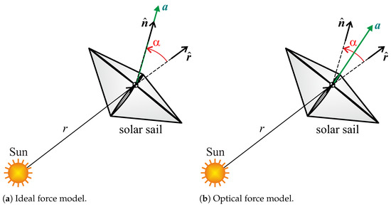 Using the values of from Table 1, Equations (3)–(5) give the force coefficients reported in Table 2. Note that, according to the values of Table 2, in an ideal force model the propulsive acceleration vector is aligned with the normal unit vector . Assuming, instead, an optical force model, the direction of is between the direction of and that of , as sketched in Figure 1, where is the cone angle, defined as the angle between and .