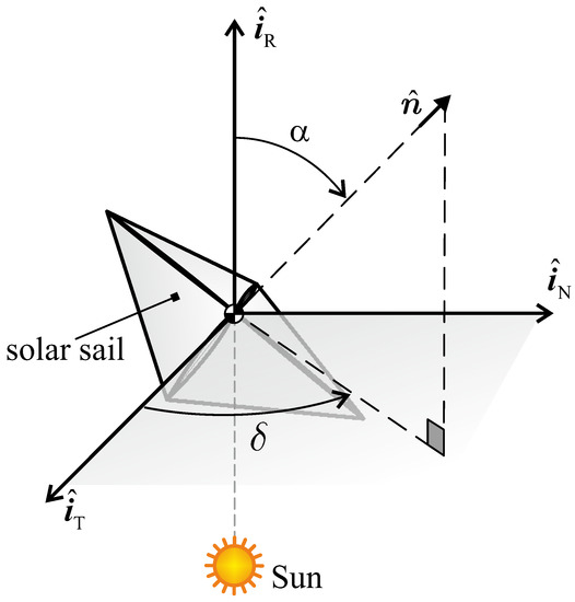 where r is the Sun–spacecraft distance, is a reference distance, is the characteristic acceleration, defined as the maximum value of when , is the Sun–spacecraft unit vector, is the unit vector perpendicular to the sail nominal plane (in the opposite side of the Sun), whereas are the dimensionless force coefficients [30], which depend on the optical characteristics of the sail reflective film and are defined as