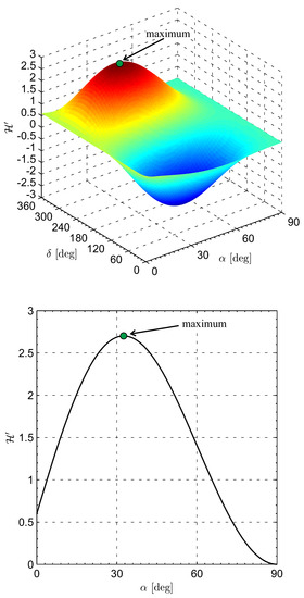 Consider, for example, a set of heliocentric canonical units [39] (so that the Sun’s gravitational parameter is 1), an optical force model with the force coefficients reported in Table 2, and assume , , , , , , , , , , , . In that case, the maximization of gives and , as illustrated in Figure 3, which shows the general function , and the reduced function obtained by considering the (optimal) value of the clock angle given by Equation (42).