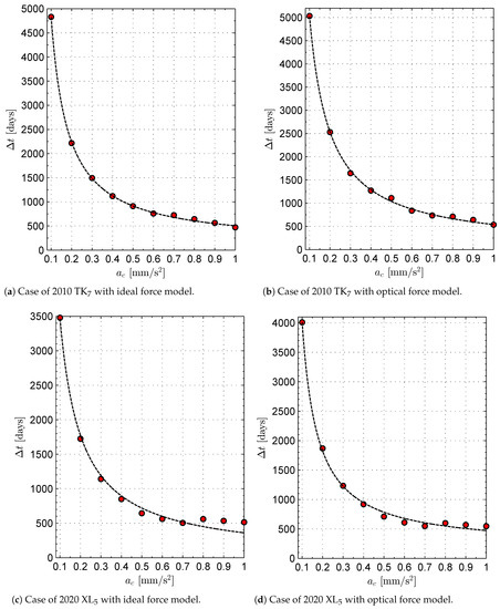 where is expressed in days, is in millimeters per square second, and the best fit coefficients are reported in Table 6. Figure 4 shows a comparison between the numerical simulation results and the approximate function given by Equation (47). As expected, when a low characteristic acceleration is considered in the optimization process, the value of N tends to increase (see the last column in Table 4 and Table 5), and the transfer trajectory becomes more involved. This aspect is confirmed by Figure 5, which shows the minimum-time transfer trajectory for the two Earth–ETa mission cases (assuming an optical force model) as a function of the characteristic acceleration .