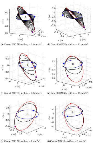 Optimal Earth–ETa transfer trajectory (black line), assuming an optical force model, as a function of the characteristic acceleration. Blue line → Earth’s orbit, red line → asteroid orbit, blue circle → start, red circle → arrival, blue star → Earth’s orbit perihelion, red star → asteroid orbit perihelion, yellow circle → Sun.