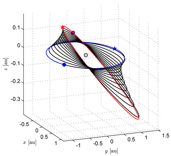 The vectorial equation of motion (13) gives a system of six scalar differential equations, which is completed by a set of suitable initial conditions. Recalling that the spacecraft angular positions on the initial and the final orbit are both left free, five initial conditions are obtained by observing that the initial values of coincide with those on the Earth’s heliocentric orbit, whereas the initial value of the remaining MEOE (that is, the value of L) is an output of the optimization process described in the next section. The initial values of the classical orbital elements of Earth’s heliocentric orbit have been retrieved from the JPL Horizons on-line ephemeris system, and the corresponding initial values of have been calculated with the aid of Equations (28)–(32)
