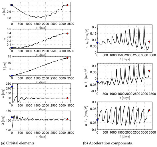 Time variation of the osculating orbit elements and propulsive acceleration components (in an RTN reference frame) in an Earth–asteroid 2020 XL transfer, with and an optical force model. Blue circle → start; red circle → arrival.