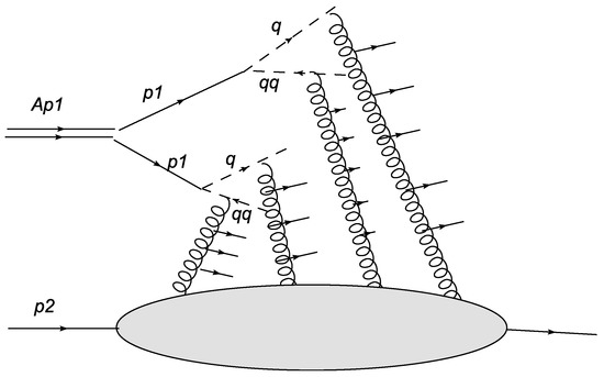 Due to partonic distribution in x, the strings have different lengths; moreover, they can take different positions in rapidity with respect to the center . The sea distribution in a hadron is much softer than the valence one. In fact, the sea distribution behaves as near , meaning that the average value of x for sea partons is small, on the order of [15]. As a result, strings attached to sea partons in the projectile nucleus carry very small parts of longitudinal momentum in the forward direction, and these fall with energy; as such, they seem to be useless for building up the cumulative particles. This allows us to retain only strings attached to valence partons, that is, quarks and diquarks, in the projectile while neglecting those strings attached to sea quarks altogether. This is reflected in Figure 1, where we show only the valence partons in the projectile. Note that the number of the former is exactly equal to , and does not change with energy. Thus, independent of the energy, for a given nucleus we always have a fixed number of strings.