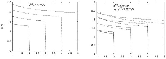 For both proton–nucleus and nucleus–nucleus collisions, it is necessary to know the probabilities of fused string formation and the observed particle distribution . The former is determined by Equation (26) and the recurrent relation (29), while the latter is fully expressed by the powers , which in turn are determined by Equation (21) with . In fact, fused strings formed from more than five simple strings are not found in our calculations for either p-A or A-A collisions. For , the results of our numerical calculations provide and , which are presented in Figure 3, Figure 4 and Figure 5. At fixed , grows with n in accordance with Equation (21).