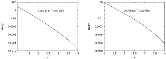 Very recent experimental study of cumulative production has been performed with Cu–Au collisions at 200 GeV [14]. Cumulative jets were detected with cm energy E greater than allowed by the proton–proton kinematics GeV. These data have been presented in two forms: raw data coming from the detectors, and so-called unfolded data, which presumably take into account distortions due to different sources in the concrete experimental setup. Remarkably, in the cumulative region the raw data fall exponentially as provided by (30), with a slope which does not practically depend on either centrality or jet characteristics. Our results in this paper refer instead to collisions of identical nuclei, such as Cu–Cu or Au–Au; however, as we have argued, the cumulative production in the projectile region does not depend on the target, the influence of which is only felt via the overlap in the transverse space. With different nuclei, the number of active nucleons will be different; nonetheless, in our picture this will influence only the magnitude of the production rate, not its x-dependence. Therefore, the observed slope agrees well with our predictions.