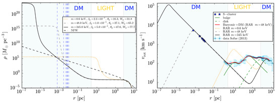 DM density profiles (left) and rotation curves (right), from pc to pc, for three representative fermion masses , 48, and 345 keV. The vertical dashed blue lines in the left plot indicate the position of the S-cluster stars [47], and the dashed black curve represents the NFW density profile obtained in Sofue [45]. Reprinted from [32], Copyright (2018), with permission from Elsevier.