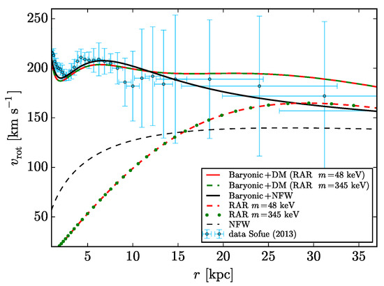 As was explicitly shown in [32,33,50], this new type of dense core–diluted halo density profile suggests that the DM might explain the mass of the dark compact object in Sgr A*, as well as the halo mass. It applies not only to the MW but also to other galactic structures, from dwarfs and ellipticals to galaxy clusters [33]. Specifically, an MW analysis [32] has shown that this DM profile can indeed explain the dynamics of the closest S-cluster stars (including S2) around Sgr A* and to the halo rotation curve without changing the baryonic bulge disk components (see Figure 1 and Figure 2). Therefore, for a fermion mass of 48–345 keV, the RAR solutions explain the Galactic DM halo and, at the same time, provide a natural alternative to the central BH scenario.