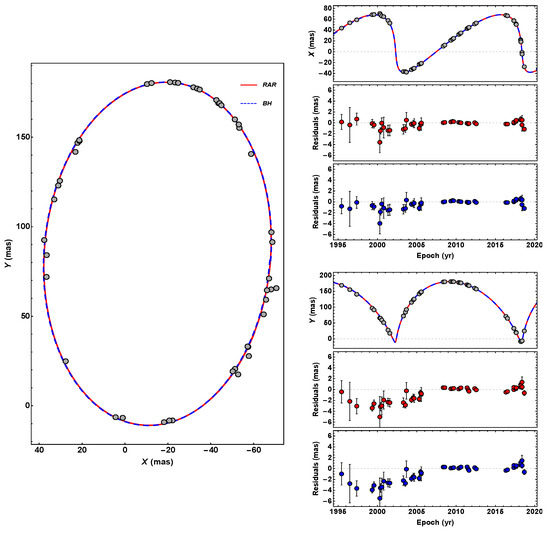 Theoretical (central BH and RAR models) and observed orbit of S2 around Sgr A*. The left panel shows the orbit, i.e., the right ascension (X) vs. declination (Y), while the right panel shows X and Y vs. observation time, with the residuals of the best fit for the BH (blue) and the RAR (red) models. The theoretical models are calculated by solving the equations of motion (see Appendix A) of a test particle in the gravitational field of (1) a Schwarzschild BH of , and (2) the DM-RAR model for 56 keV fermions (leading to a quantum core mass ). Reproduced from [34] with permission from Astronomy & Astrophysics, Copyright ESO.
