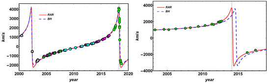 Theoretical and observed line-of-sight radial velocity for S2 (left) and G2 (right), calculated for the same models as in Figure 3. Both models can fit the data with similar precision S2, and, for G2, the RAR model fits the data with noticeably better precision than the BH. Reproduced from [34] with permission from Astronomy & Astrophysics, Copyright ESO.