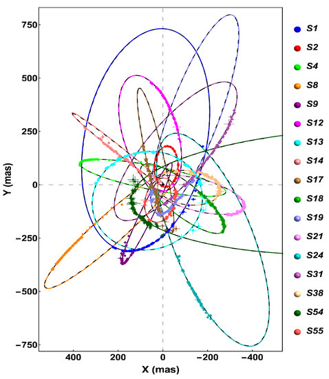 - Gillessen, S.; Eisenhauer, F.; Fritz, T.K.; Bartko, H.; Dodds-Eden, K.; Pfuhl, O.; Ott, T.; Genzel, R. The Orbit of the Star S2 around SGR A* from Very Large Telescope and Keck Data. Astrophys. J. 2009, 707, L114–L117. [Google Scholar] [CrossRef]