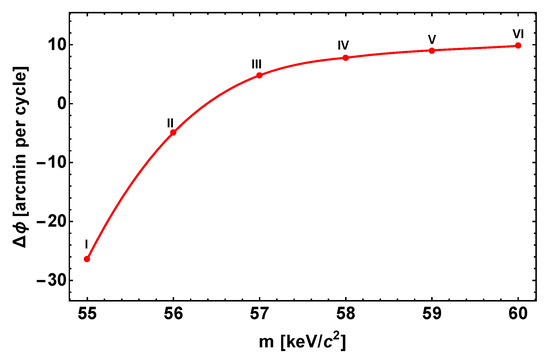 Therefore, for larger and larger particle masses, the behavior of the RAR model tends to be that of the BH. As Figure 6 shows, the precession tends nearly asymptotically to 12 arcmin (≈ deg), the predicted precession of a central Schwarzschild BH (see, e.g., [57]). The RAR model produces the same prograde precession of a central BH for 345 keV fermions, corresponding to the unstable DM core for gravitational collapse into a BH. For keV fermions, the prograde and retrograde contributions balance each other, leading to a zero net precession. For lower masses, the net precession is retrograde. It has been shown in [36] that currently available data constrain the amount of retrograde precession, imposing a lower limit to the fermion mass of ≈57 keV, and hence an upper limit to the amount of mass enclosed in the orbit of ≈ of the core’s mass (see Table 1). Indeed, the latter limit agrees with the one obtained by [57]. For fermion masses above 57 keV, the prograde precession of the RAR model and that of a central BH agree within the experimental uncertainties. The reason has been explained in [36]: the most accurate S2 data correspond to its pericenter passage [57,58], while the best place to analyze orbital precession is around the apocenter.
