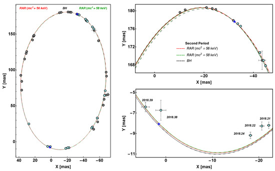 The above is shown in Figure 7, which plots the relativistic precession of the S2-projected orbit in a right ascension–declination plane. It can be seen that while the positions in the plane of the sky nearly coincide about the last pericenter passage in the three models, they can be differentiated close to the next apocenter. Specifically, the upper right panel evidences the difference at the apocenter between the prograde case (as for the BH and RAR model with keV) and the retrograde case (i.e., RAR model with keV).