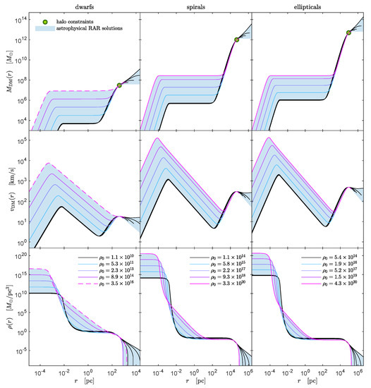 Astrophysical RAR solutions, for the relevant case of keV, observationally fulfill given DM halo restrictions for typical dwarf (left), spiral (middle), and elliptical galaxies (right). Shown are density profiles (bottom), rotation curves (middle), and DM mass distributions (top). The full window for each galaxy type is illustrated by a blue shaded region and enveloped approx. by 5 benchmark solutions inside. Each solution is labeled with the central density in units of pc. The continuous magenta curves, occurring only for spiral and elliptical galaxies, indicate the critical solutions that develop compact, critical cores (before collapsing to a BH) of . The dashed magenta curves for dwarfs are limited (instead) by the astrophysical necessity of a maximum in the halo rotation curve. The bounding black solutions correspond to the ones having the minimum core mass (or minimum ), which in turn imply larger cutoff parameters (implying when . Reprinted from [33], Copyright (2019), with permission from Elsevier.