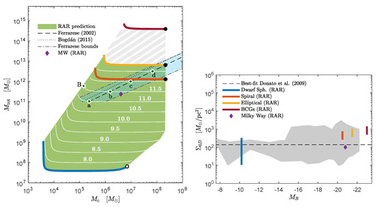- Di Paolo, C.; Salucci, P.; Fontaine, J.P. The Radial Acceleration Relation (RAR): Crucial Cases of Dwarf Disks and Low-surface-brightness Galaxies. Astrophys. J. 2019, 873, 106. [Google Scholar] [CrossRef]