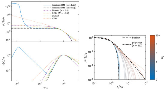 - Chavanis, P.H. Predictive model of fermionic dark matter halos with a quantum core and an isothermal atmosphere. Phys. Rev. D 2022, 106, 043538. [Google Scholar] [CrossRef]