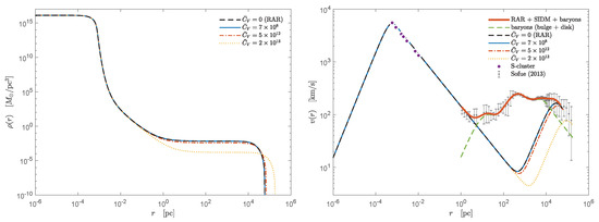 For galaxy types located far away from us, the observational inferences of their DM distributions are limited to a narrow window of galaxy radii, typically from a few up to several half−light radii. Generally, we have no access to observations for the possible detection of a central dark compact object (as for SgrA* in our galaxy), nor to constrain the system’s total (or virial) mass. Thus, we adopt here (see [33] for further details) a similar methodology as applied to the MW (as shown in Section 3 and detailed in [32]), but only limited to halo scales where observational data are available (i.e., we do not set any boundary mass conditions in the central core). In particular, we select as the boundary conditions a characteristic halo radius with the corresponding halo . The halo radius is defined as the location of the maximum in the halo rotation curve, which is defined as the one-halo-scale length in the RAR model. We list below the parameters (, ) adopted for the different DM halos as constrained from observations in typical dwarf spheroidal (dSph), spiral, elliptical galaxies, and bright galaxy clusters (BCG). We only exemplify the first three cases; see [33] for the BCGs.