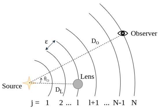 Schematic representation of a lensing system with coordinate system originating at the source and polar axis pointing towards the lens. The distance between the source and lens is , and is the source-to-observer distance. The distance between the source and observer is divided into an infinitely large integer N by concentric spheres centered on the origin, and is the distance of the lens from the l-th sphere.