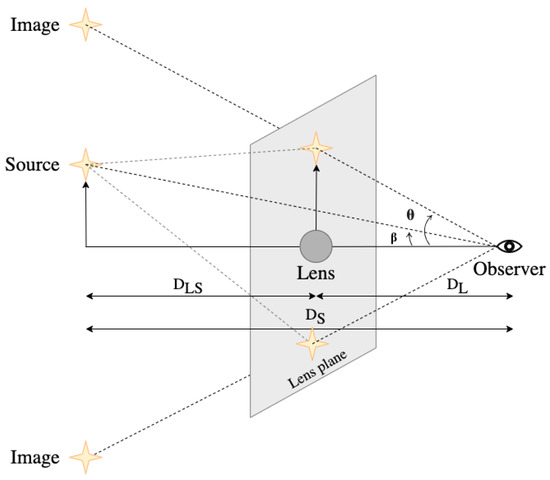 for which we have introduced the notations commonly used in the literature regarding gravitational lensing theory. Namely, is the angular separation between the lens and the image as seen by the observer; is the angle between the distance from the observer to the source’s true location and to the lens; , , and are distances to the lens, to the source, and between the lens and the source (see Figure 2).