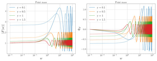 Amplification factor for different impact factors, y, for a point mass lens. The left plot shows the total amplification, and the right plot shows the amplification factor phase, both in terms of the dimensionless frequency w. The solid line depicts the analytical solution of the amplification factor in the wave optics regime for a point mass lens, as in Equation (24). The dashed line follows Equation (30), namely, the amplification factor in the geometrical approach.