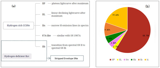 Supernovae are huge explosions that take place at the end of the evolution of stars. They exhibit great diversity and can be divided into different subclasses based on their observational characteristics. The first-order classification of supernovae is based on whether hydrogen lines are shown in their spectra. Those that do not contain hydrogen in their spectra are classified as type I supernovae (SNe I), while those that show clear hydrogen are divided into the class of Type II supernovae (SNe II) [1]. With more and more supernovae detected by modern techniques, the classification scheme was extended according to additional spectral or photometrical properties. SNe I were divided into SNe Ia, SNe Ib, and SNe Ic, while SNe II were divided into more subcategories, i.e., SNe IIP, SNe IIL, SNe IIb, SNe IIn, and SN 1987A-like objects [2,3]. The difference in observational properties reflects the difference in stellar state (e.g., type, mass, metallicity, rotation, whether in binary system, etc.) and circumstellar environment of the progenitor star [4,5,6,7,8].