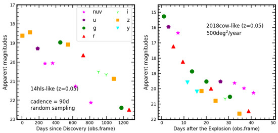 Recent surveys have revealed new classes of peculiar transients, e.g., the bright, long-lived multipeak iPTF14hls and Fast Blue Optical Transients (FBOT). A series of models have been proposed for iPTF14hls [159,160,161,162,163] and FBOT 2018cow [164,165,166,167,168], however, their true nature is still under debate. These peculiar transients, which pose significant challenges to conventional supernova explosion physics, are critical for understanding the stellar evolution theory. Considering the FoV of all seven filters and the exposure time of 150 s, the multiband main survey camera will take about 90 days to cover the whole 17,500 deg. Such a survey strategy is powerful in observing the long-lived supernova, as well as pre-SN activities. In Figure 5, we simulate the observation results (each mock sampling randomly selects a certain filter) taken by the multiband camera for iPTF14hls-like events and 2018cow-like events. The bright iPTF14hls-like events at z = 0.05 could be observed for years. However, a survey strategy with a high cadence (e.g., covering 500 square degrees in one year) should be conducted for those fast-evolving events.