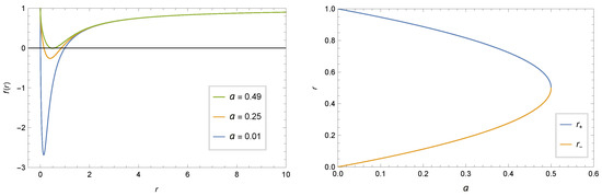 (Left): the metric function for . (Right): the event horizons for .
