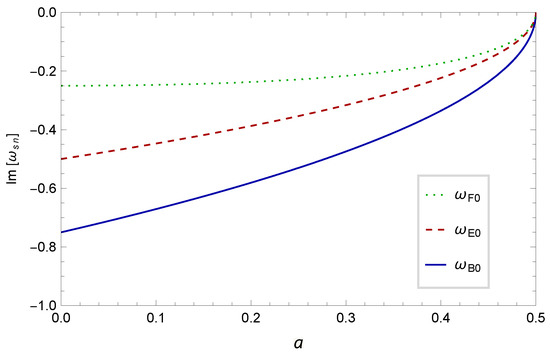 In Table 1, we present some values of the quasibound state , as well as the corresponding separation constants and coefficients , as functions of the GB coupling constant a. We also show the behavior of the quasibound states in Figure 2, as functions of the GB coupling constant a. From these results, we can conclude that all solution for the massless resonant frequencies are physically admissible in the fundamental mode, which represents the spectrum of quasibound states in the 4DEGBBH spacetime. In this scenario, the radial solution given by Equation (18) tends to zero far from the 4DEGBBHs at asymptotic infinity, since . In addition, we can see that the motion of all the test fields are overdamped (with purely imaginary frequencies). Furthermore, all the test fields may describe stable systems, since there is no change in the sign of the imaginary part of their massless resonant frequencies in the stability region, that is, when . We can also see that the imaginary part of the massless resonant frequencies (for all the test fields in these modes) decreases (in modulus) as the GB coupling constant a approaches to 1/2.